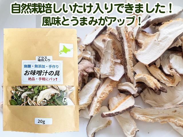 原材料は、三陸産ワカメ、自然栽培大根・人参、玉ねぎ、白菜です。 丁寧にカットして、じっくり低温乾燥、できたものをおみそ汁に合うように絶妙にブレンドしました。新たにしいたけ入りもできました。たっぷり!50g入りとお試し20g入りです。