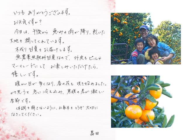 農薬を使わない分、日々の手取り除草をかかさず、大切に大切に育てた甘夏です。