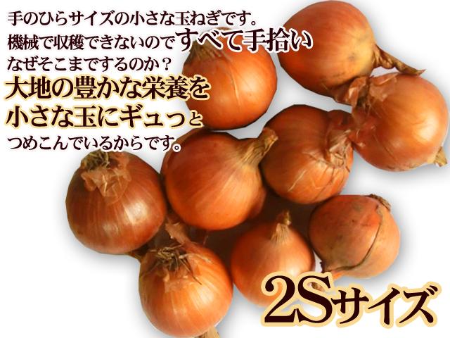 2Sサイズ:ピンポン玉サイズの小さな玉ねぎです。機械で収穫できないので、手拾いとなります。この小さなサイズに大地の栄養がぎゅっとつまって、特に味わいが良いのです。