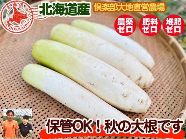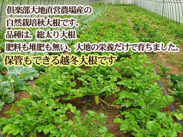 自然栽培秋大根「なつかし大根」、耐病総太り大根です。産地は、北海道置戸町Club大地直営農場、生産者は福澤順宣・香織夫妻です。