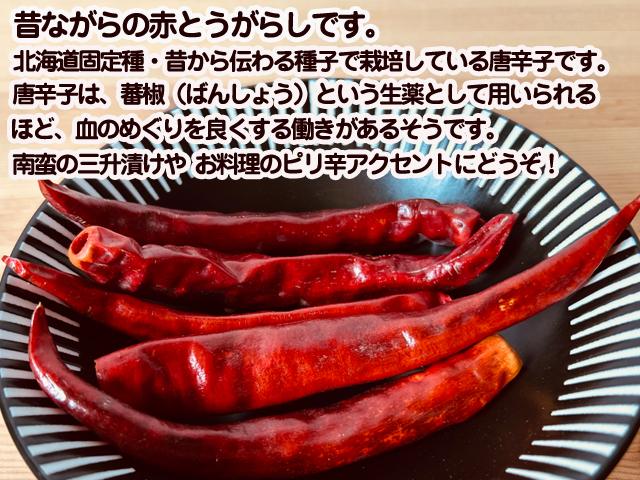 北海道置戸町・倶楽部大地直営農場産の北海道固定種。農薬不使用・無肥料・無たい肥で育てた自然栽培赤とうがらし(=鷹の爪)です。青唐辛子が赤くなったものです(鷹の爪)。自家採種歴は17年目。旨辛です!