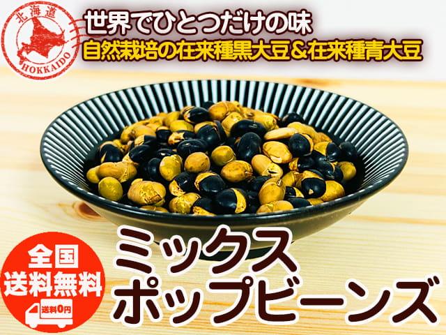 北海道在来種、昔から伝わる黒大豆と青大豆、自然栽培で育てたお豆をポン菓子にしました。「豆だらけ」は、無添加・無糖で作られるポン菓子です。