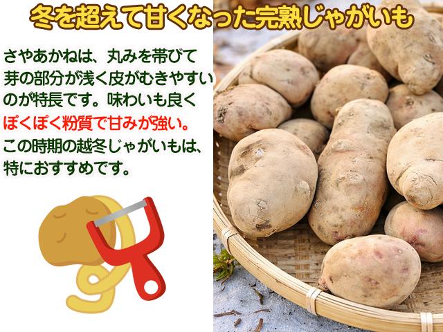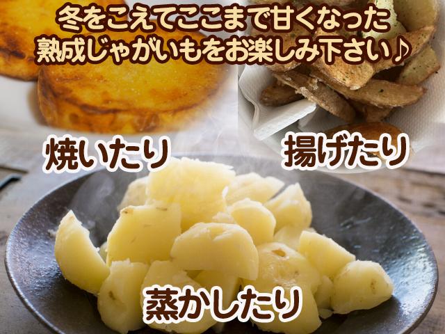 調理しやすいのが特徴です。味わいも良く、ポクポク粉質で甘みが強い、熟成させるとより甘みが増すので、この時期の越冬じゃがいもは特においしくおすすめです。