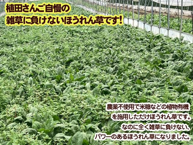 農薬不使用・無肥料・堆肥は米糠等の植物有機を施用しただけの元気なほうれん草です。