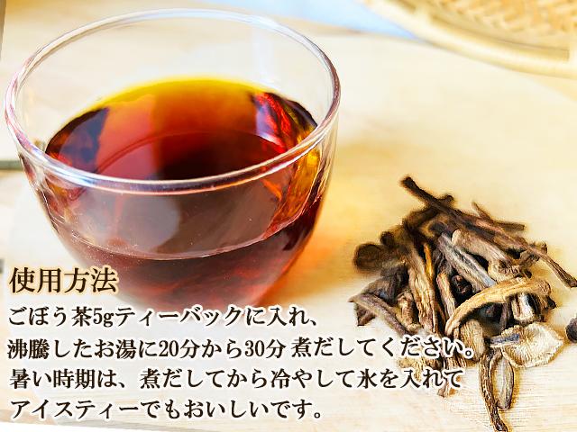 <作り方>ごぼう茶5gティーバックに入れ、沸騰したお湯に20分から30分煮だしてください。暑い時期は、煮だしてから冷やして氷を入れて、アイスティーでもおいしいです。