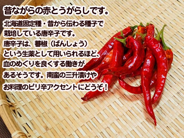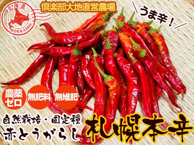 北海道置戸町・倶楽部大地直営農場産の北海道固定種。農薬不使用・無肥料・無たい肥で育てた自然栽培赤とうがらし(=鷹の爪)です。青唐辛子が赤くなったものです(鷹の爪)。自家採種歴は17年目。旨辛です!