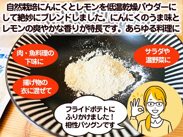 自然栽培ジャンボにんにくと自然栽培レモンを贅沢に使った万能パウダーです。