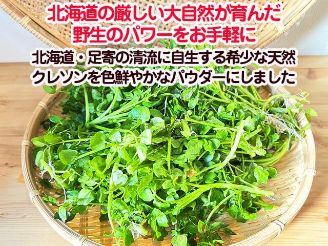 北海道・足寄の清流に自生する希少な天然クレソンを丁寧に手摘み、色鮮やかなパウダーに仕上げました。パウダーなら。いつでも手軽にクレソンを楽しめます。